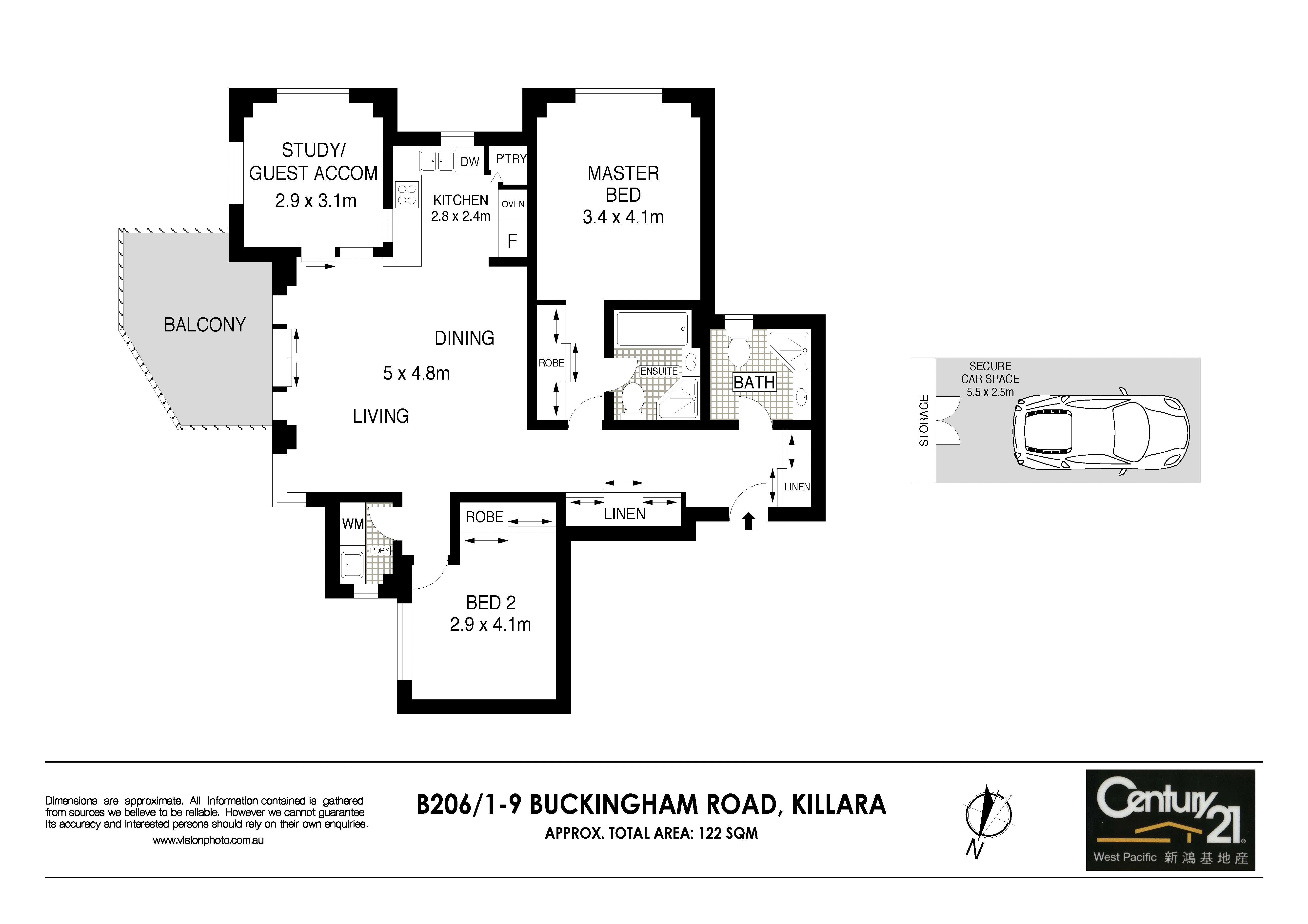Large master with en-suite and built-in wardrobe. Spacious second bedroom also with built-in wardrobeSeparate spacious study doubling as guest accommodationModern gas cooking kitchen with Miele appliances.Contemporary bathroom and en-suite with separate bath Internal laundry with dryer; ample storage Gas bayonet in balcony for BBQKillara High catchment and many highly-regarded schools in vicinity.Security 1 car space with storage, inter lift access Security intercom, ducted R/C air-conditioning. Low maintenance security building.Approx outgoings per qtr: Strata $900, Council $313, Water $168